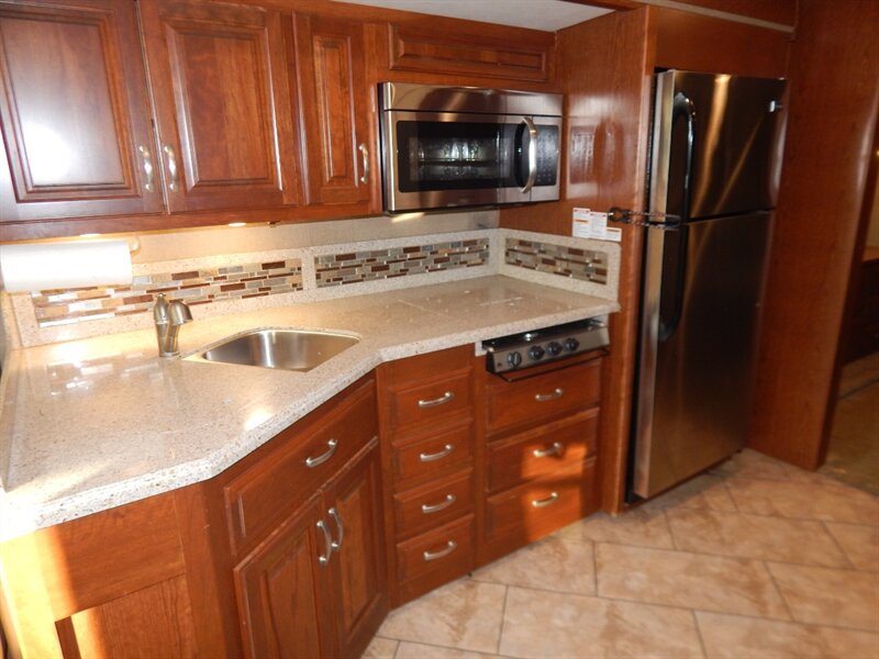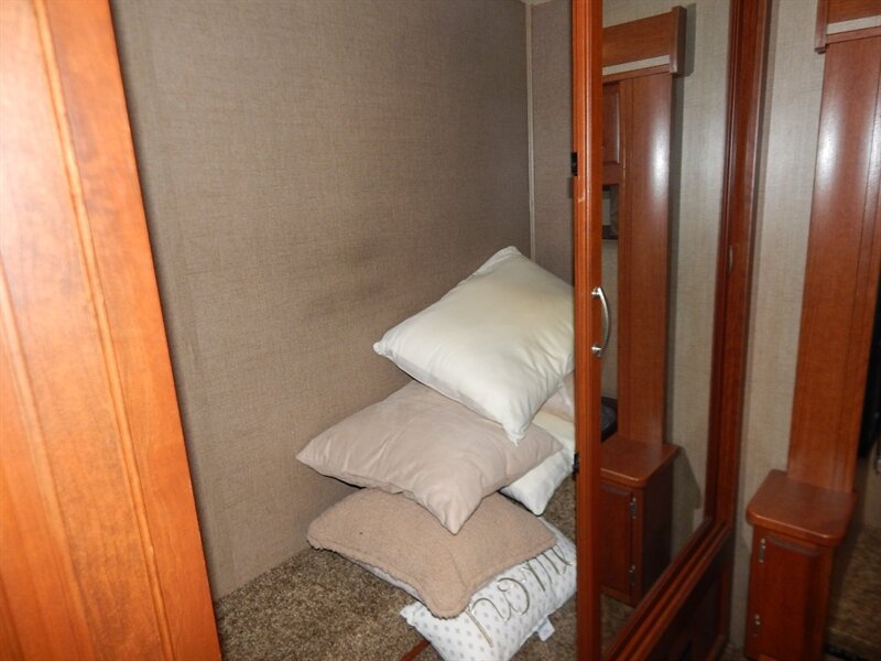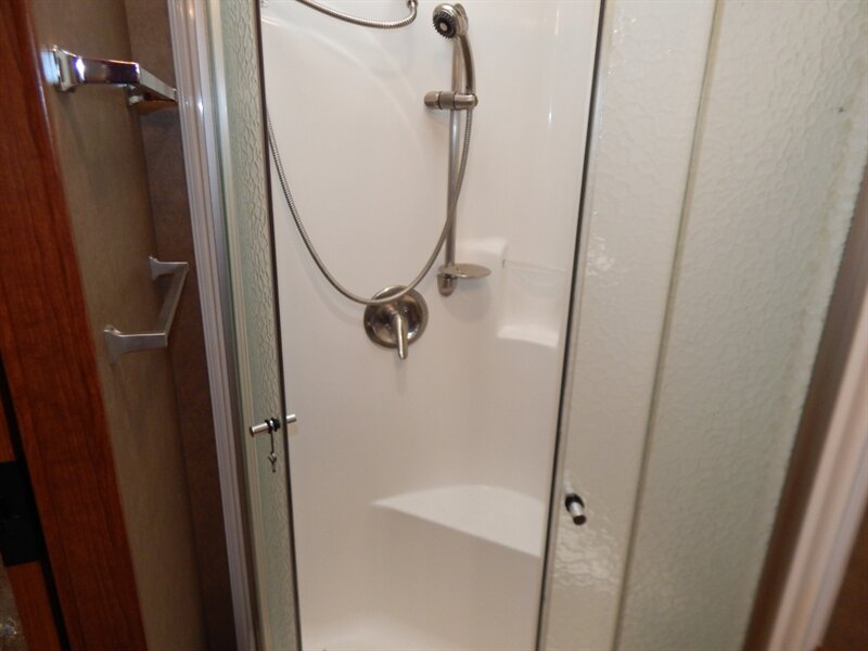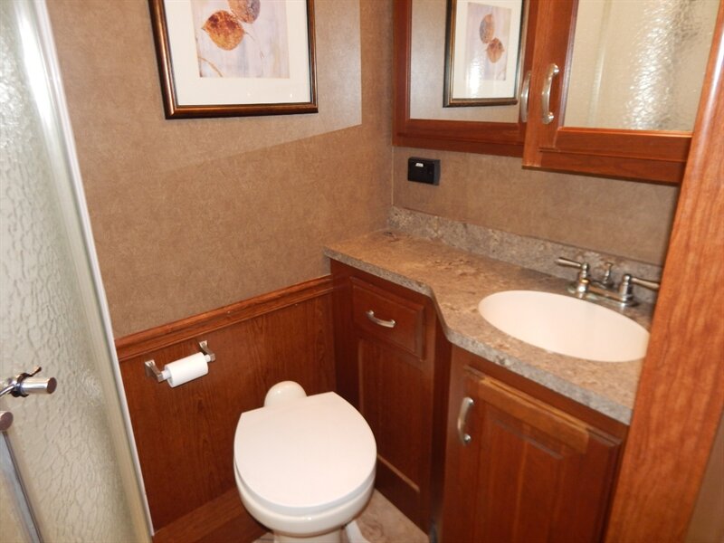 A few other features you will find on the 2016 Berkshire include a Water Manifold System, Whole House water filtration system, vacuum bonded floors and sidewalls, LED Ceiling lighting with Dimmers, power patio awning with LED lighting and entrance door awning, a one-piece windshield, crowned & layered vacuum bonded fiberglass roof, steel bulkhead, Powered front MCD night shade, MCD shades throughout, solid surface countertop, 7 foot ceiling height, power step well cover, Diamond Shield front mask protective film, 2 low profile A/C units with heat pump, rear ladder, Rear Mud Flap with Chrome Trim, 30” Stainless Steel Convection/Microwave, Stainless Steel Residential Refrigerator, heated and remote exterior mirrors and a 2,000 Watt Magnum inverter with automatic generator start.
